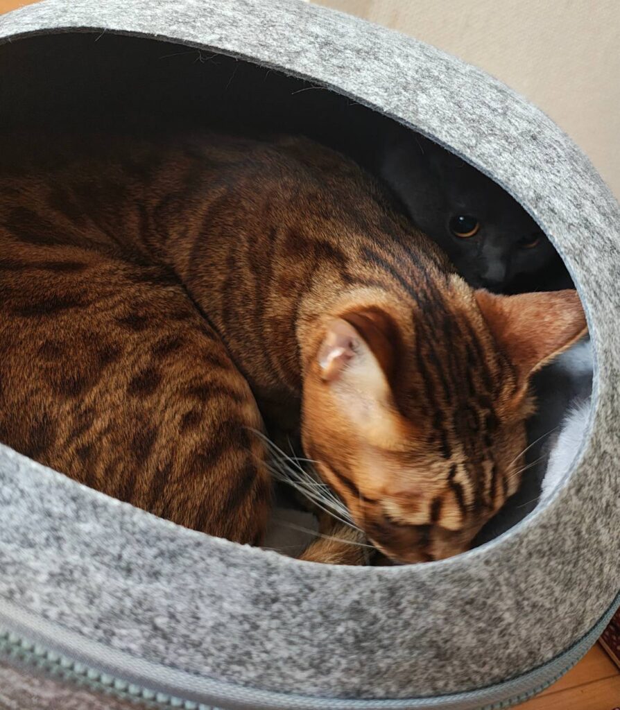 もっと柔らかくふかふかで暖かいトンネル型やドーム型のベッドもすでにあるのですが、いつも他の猫に潰されて中で唸っている子がいるので、上に乗っても硬く潰れないものをチョイス。