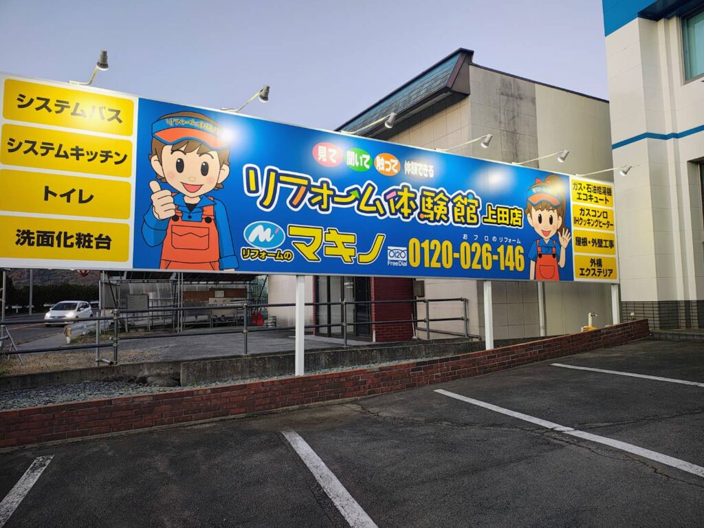 明日はリフォーム体験館上田店の休館日なので、旗を仕舞いに行ったら看板もライトアップされておりました。