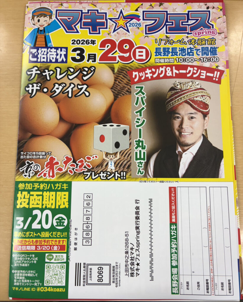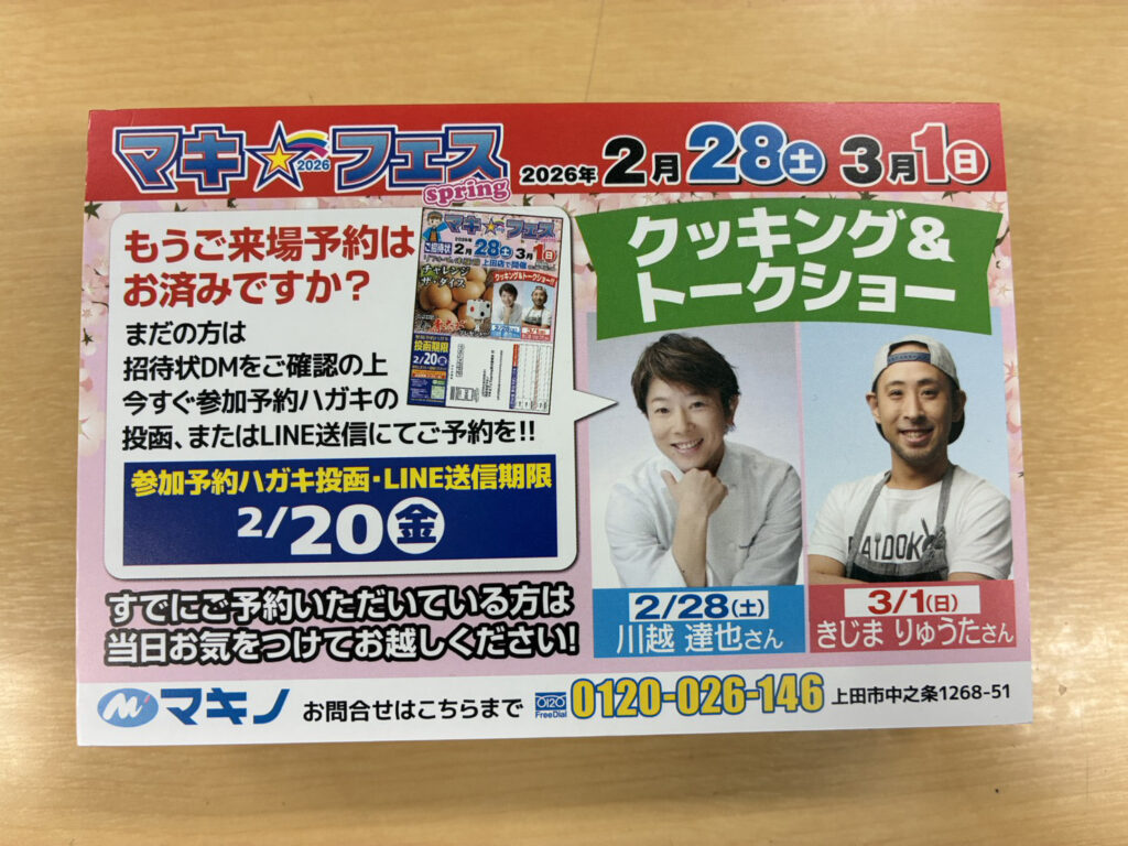 春のマキフェス上田会場まであと2週間を切りました。我々スタッフもイベントに向けて着々と準備を始めています。 先日、上田エリアにお住まいの方へご来場予約のお知らせハガキをお送りしましたが見ていただきましたでしょうか? イベ […]