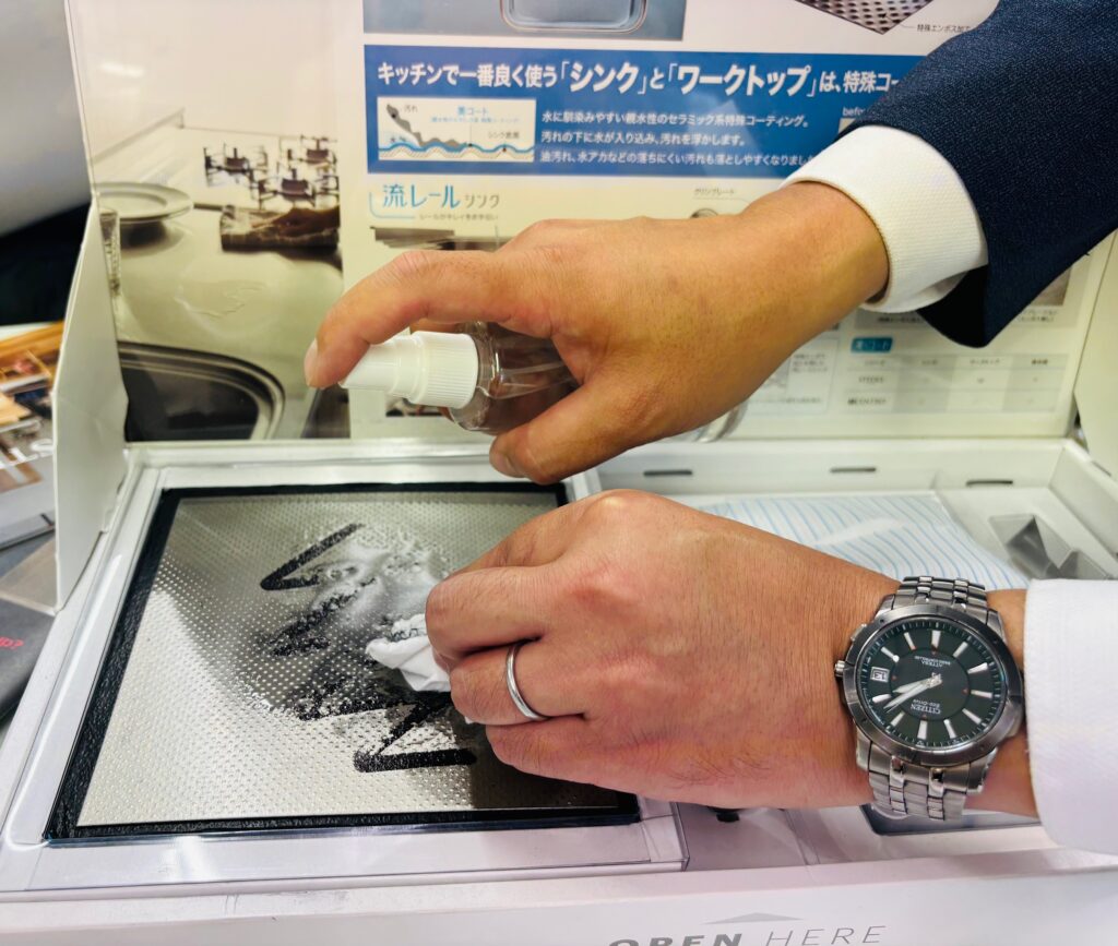 実際に、美コート上のステンレスに油性マジックで書いたところへ水スプレーを吹きかけ