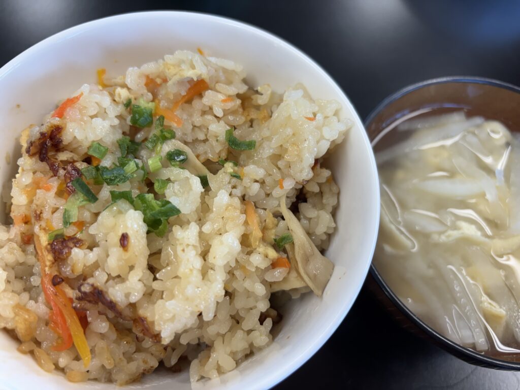 本日のまかないは炊き込みご飯。鶏のいろどり炊き込みご飯、かな。おしながきがわからないのですが。